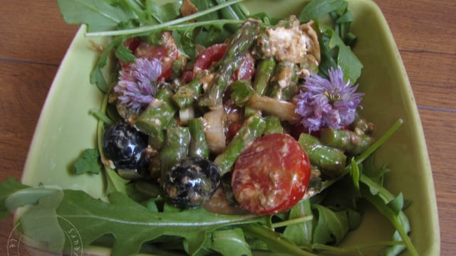 Dans un saladier, rassembler les ingrédients suivants: 20 pointes d'asperges cuites, 1 poivron rouge pelé, épépiné et détaillé en petits dés, 250g de tomates cerise coupées en 2, 20 olives noires, 1 c à s de graines de fenouil, 4 petites cébettes émincées.