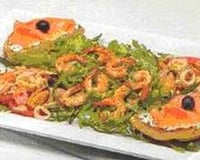 Amateurs de crevettes, vous avez envie de déguster une salade de la mer ? Cette recette devrait vous régaler. Tout d'abord, vous allez commencer par couper vos tomates en tranches et votre saumon fumé en petits morceaux. Ensuite, vous allez toaster vos tranches de pain foccacia et les garnir avec un peu de ricotta aux herbes (ou bien un autre fromage frais). Dans une poêle, versez un filet d'huile d'olive et faites revenir à peine quelques minutes vos crevettes. A la fin, assaisonnez le tout avec quelques cuillères de sauce pesto du commerce. Maintenant, vous allez dresser les assiettes avec de la roquette ainsi que tous les autres ingrédients. En guise de sauce pour cette salade de la mer, vous allez opter pour du vinaigre balsamique et une pincée de ciboulette. C'est un délice !