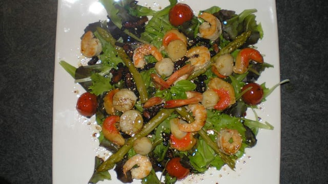 Une salade verte, accompagnée de tomate et cocombre, agrémentée de saumon, crevete et noix de st jacques.
