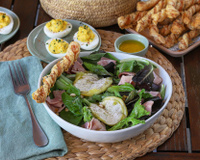 Préparer la sauce : peler et émincer très finement l'échalote. Mettre dans une petite jatte l'huile, le vinaigre, la moutarde, saler et poivrer. Ajouter l'échalote et la ciboulette. Bien mélanger.