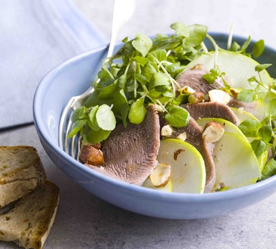 Réchauffer légèrement la langue dans un peu de bouillon puis l'égoutter. La rajouter dans le saladier avec le cresson et les pommes. Parsemer de noisettes et servir tout de suite.