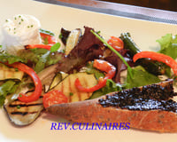 Une recette aux parfums méditerranéens, des légumes parfumés et grillés à la moutarde Provençale, des tomates cerises légèrement confites à l'huile d'olive, un chèvre frais et sa quenelle de confiture d'olives, le tout saupoudré d'herbes... Le rosé au frais... Du soleil, des couleurs, des saveurs... le rêve éveillé... que du bonheur !