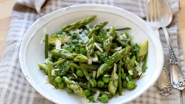 Versez les petits pois et les pois gourmands dans un grand bol, coupez les haricots verts en deux et ajoutez-les dans le bol. Coupez les asperges en tronçons, sauf la pointe et ajoutez tout dans le bol.