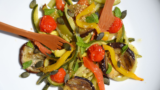Une salade fondante et croquante à la fois. La menthe ciselée ajoutée ici en fait un plat tout particulièrement frais, à déguster au soleil. Les légumes, quant à eux, fondent en bouche grâce à leur cuisson au four.
