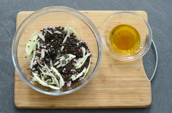 4Lorsque les lentilles sont cuites, mais encore un peu fermes, mélangez-les avec les lamelles de fenouil et les échalotes.