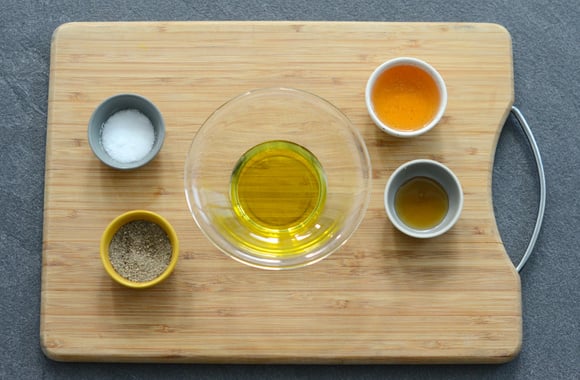 3Préparez la vinaigrette : mélangez l’huile d'olive, le vinaigre de cidre, le miel, 1 pincée de sel et du poivre.