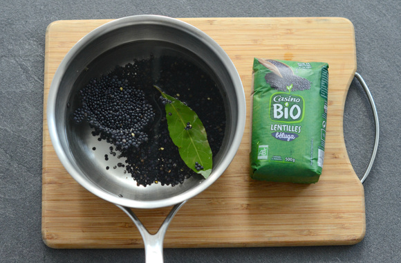 1Versez les lentilles dans une casserole avec 2 verres d'eau, la feuille de laurier et un peu de sel. Laissez cuire selon le temps indiqué sur le paquet.
