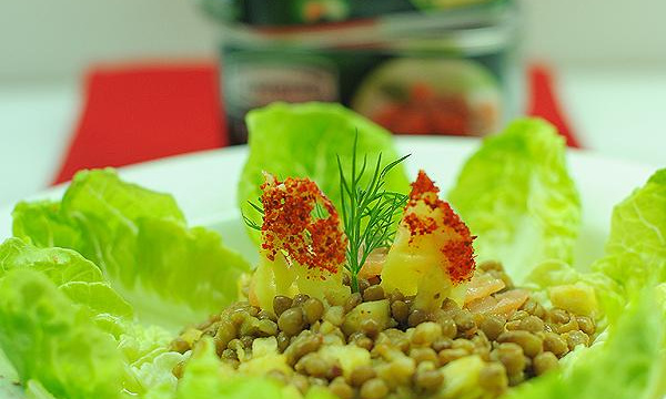 Disposer dans un plat les feuilles de sucrine, verser la préparation lentilles-ananas-saumon au centre. Décorer éventuellement de quartiers d'ananas saupoudré de piment d'Espelette.