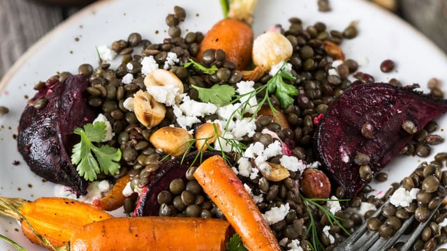 Égouttez les lentilles, versez-les dans le saladier, salez et mélangez. Répartissez-les sur 4 assiettes, ajoutez les légumes rôtis, les noisettes et la féta grossièrement émiettée à la main.