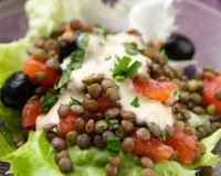 Sur chaque assiette, disposez quelques feuilles de salade, puis répartissez les lentilles, les tomates cerises coupées en quartiers et les olives. Assaisonnez d'huile, de vinaigre, de sel et de poivre.