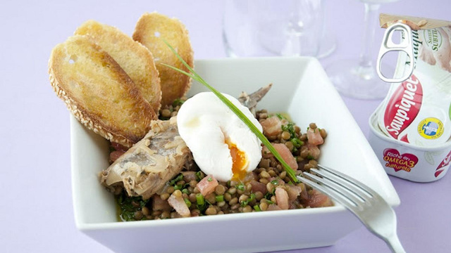 Inspiré du célèbre petit salé aux lentilles, une version maquereau en salade, agrémentée d'un œuf poché, afin que le jaune apporte de l'onctuosité et lie l'ensemble du plat.