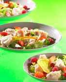Dressez la salade et le poisson sur des assiettes individuelles, décorez de fruits rouges, de rondelles d'oranges et de lamelles de gingembre, arrosez de sauce, servez.