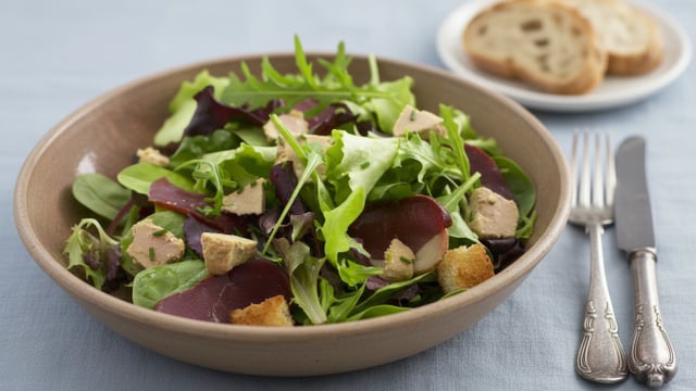 Une recette Labeyrie d'une délicieuse salade mariant foie gras, magret de canard fumé et le croustillant du pain grillé...