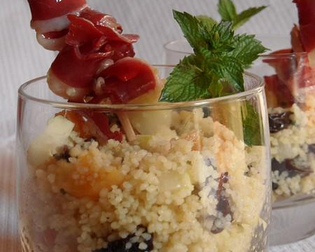 Cuire le couscous selon les indications du paquet. Bien le laisser refroidir. Couper les abricots et les pruneaux en petits dés. Laver et éplucher le concombre enlever les pépins et le détailler en petits cubes. Hacher quelques feuilles de menthe.