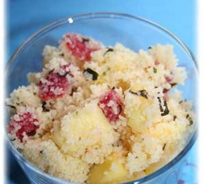 Coupez les fraises séchées en petits morceaux et mélangez délicatement tous ces fruits à la semoule, la moitié de la menthe ciselée et remettez au frais.