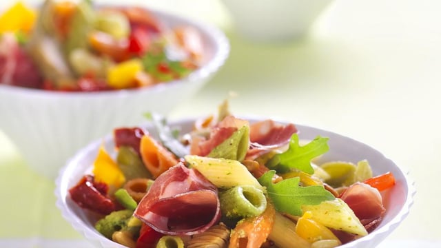 En même temps, cuire les pâtes dans un grand volume d'eau bouillante salée pendant 11 minutes. Les égoutter, les refroidir sous un jet d'eau froide pour arrêter la cuisson et verser dessus le Pesto de roquette. Laisser les pâtes refroidir et s'imprégner de sauce pendant 30 min.