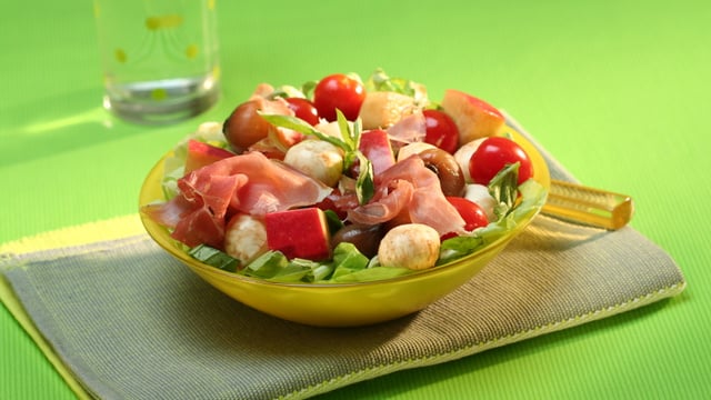 Une association classique tomates-mozzarella, repensée dans une version sucrée-salée plus gourmande, avec des pommes et de fine tranches de jambon de Parme. Idéal pour un pique-nique entre amis.