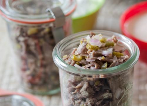 Hachez les cornichons et l'échalote. Ajoutez-les à l'effilochée de viande. - 2