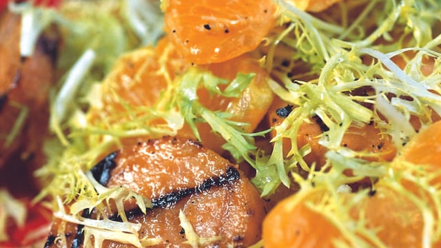 Mélangez la frisée et les quartiers de mandarines avec un peu de sauce. Répartissez-les dans des assiettes avec les patates douces grillées. Arrosez du reste de sauce et servez.