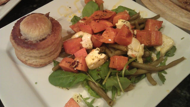 Répartir le mélange de salades vertes dans les assiettes. Ajouter les haricots,les pommes de terre. Ajouter le vinaigre dans le jus de cuisson du plat et verser par dessus. On peux aussi ajouter encore un peu d'huile d'olive.