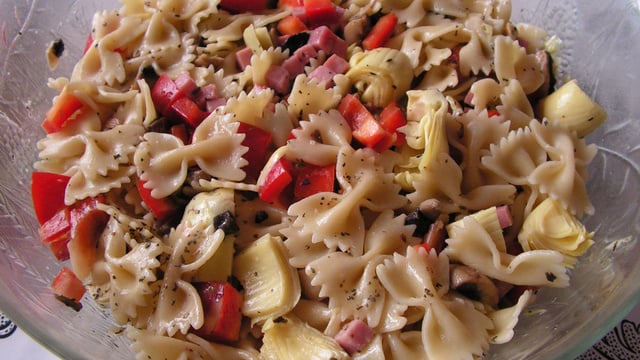 Vous cherchez une idée de salade de pâtes originale et colorée ? Si vous manquez d'inspiration ou de temps pour préparer le déjeuner ou le dîner, cette recette peut être servie en accompagnement ou en plat principal. Pour la réussir, vous avez besoin de quelques poivrons et de jambon (ou de poulet) coupés préalablement en cubes, de quartiers de cœurs d'artichaut et des champignons de Paris frais. Dans une poêle, faites revenir tous ces ingrédients avec de l'huile d'olive pendant environ 10 minutes. Dans le même temps, dans une casserole, portez les pâtes à ébullition. Il ne vous reste plus qu'à tout mélanger ! Vous pouvez servir cette succulente salade de pâtes encore chaude ou bien tiède à vos invités. C'est un délice !