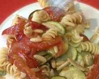 Quand les légumes sont cuits et les pâtes égouttées, mélangez dans un saladier les pâtes et les légumes. Coupez le poivron en petites lamelles et ajoutez-les.