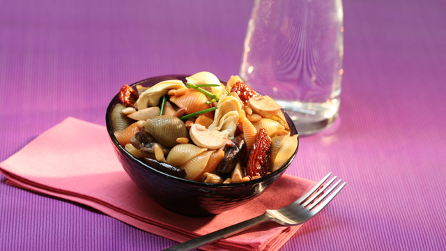 Dans un grand bol mélanger les pâtes, les légumes, les champignons, les pignons, la ciboulette, assaisonner de Vinaigrette bi-phasée huile d'olive et balsamique Amora.