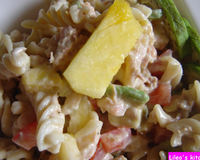 Couper la chair des avocats, l'ananas et les tomates en dés. Ajouter le thon, les crevettes et les pâtes.