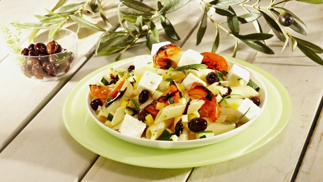 Ajoutez les courgettes, les tomates séchées, le poivron jaune et mélangez le tout. Au moment de servir décorez de dés de Salakis.