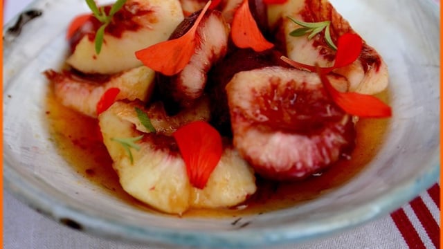 Comme j'ai un petit stock de curcuma frais, j'en profite pour écouler et tester quelques alliances possibles. Ici, je vous propose une salade de pêches du marché avec un sirop léger au curcuma. Cela fonctionne très bien comme accord.