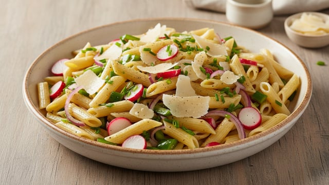 - 1. Faire cuire les pâtes le temps de cuisson indiqué sur le paquet dans un grand volume d'eau salée et les égoutter.2. Dans un grand saladier, mélanger tous les légumes et les pâtes.3. Assaisonner d'huile et de vinaigre. Saler, poivrer. Réserver au réfrigérateur minimum 1h. Au moment de servir, rajouter les copeaux de Parmesan.