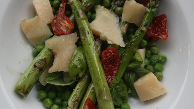 Mélangez les asperges, les petit-pois, le fromage, les tomates séchées et le basilic. Assaisonnez avec la vinaigrette, répartissez dans les assiettes et servez.