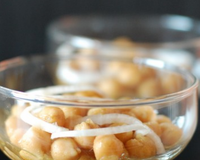 Répartir les pois chiches dans les verrines, déposer par dessus des rondelles d'oignon.