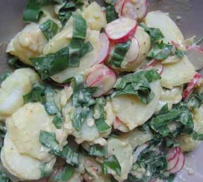 Pour la vinaigrette, mélanger tous les ingrédients. En arroser l'ail des ours et les rondelles de pomme de terre chaudes. Mélanger et laisser reposer durant 10 minutes.