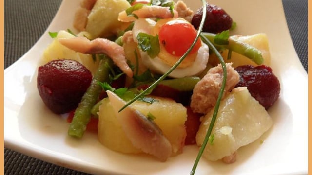 Mettre dans un saladier les pommes de terre coupées en cubes, l'oignon émincé, les haricots verts, le thon égoutté, le hareng effilé, couper les oeufs en deux ou en quatre puis versez la vinaigrette.
