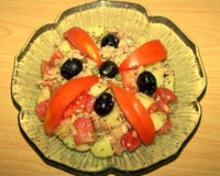 Mélangez les cubes de pommes de terre avec le thon émietté, les tomates coupées en morceaux, l'échalote hachée, les câpres et les olives noires.