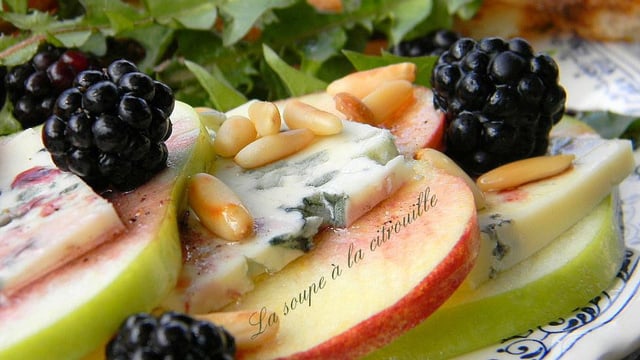 Cette fois-ci, la recette est aux fruits; pommes acides et pommes sucrées, assaisonnement au vinaigre de mûres (fait maison avec les mûres de ma haie) sur une salade de pissenlits cueillis dans le jardin, des pignons pour le croquant et quelques mûres (sauvages mais sorties du congélateur). Une jolie salade pleine de couleurs et de saveurs, associée à la douceur de la Fourme, un régal.