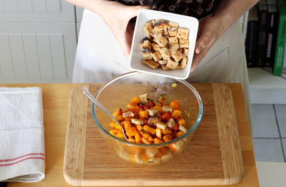 7Ajoutez les croûtons et mélangez. Laissez reposer 10 minutes.