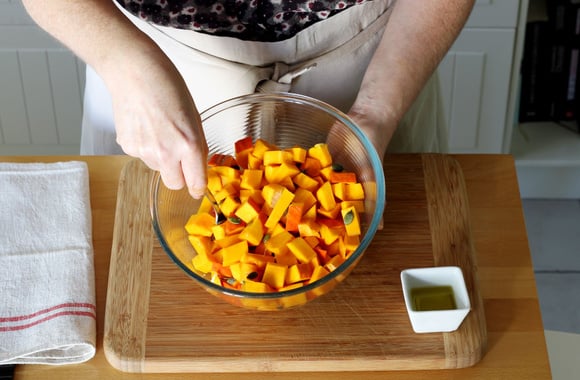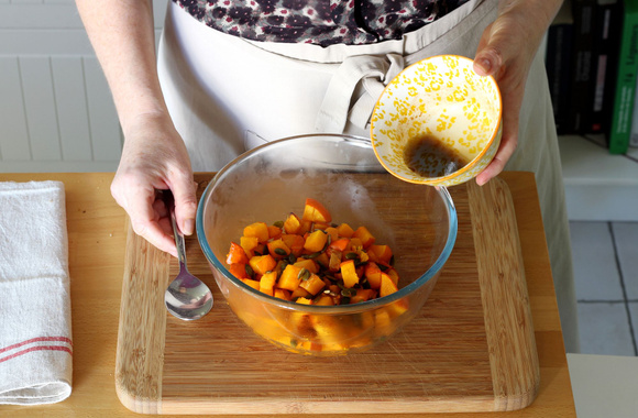 6Quand le potimarron est tendre mais pas en purée, versez-le dans un plat creux, ajoutez la vinaigrette et mélangez.