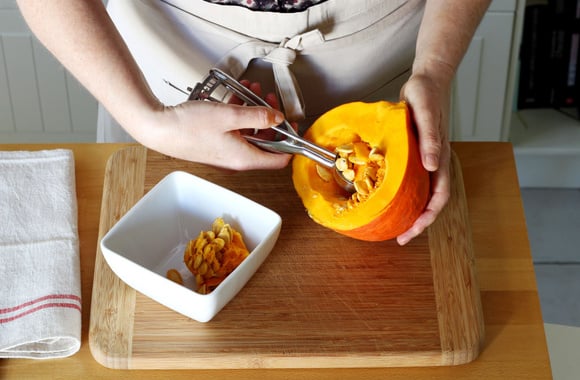 1Coupez le potimarron en deux, retirez les graines en vous servant d’une grande cuillère.
