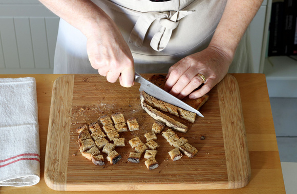 5Faites griller le pain afin qu’il soit bien doré puis coupez-le en dés.