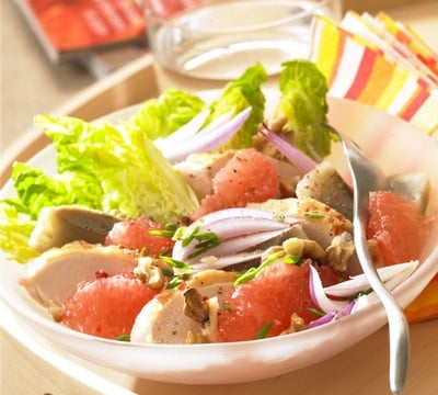 Mettez vos cœurs d'artichaut à cuire 10 min dans une casserole d'eau bouillante salée. Egouttez, laissez refroidir et coupez en lamelles. Mettez une poêle à chauffer avec 1 c à soupe d'huile d'olive et faîtes cuire vos blancs de poulet 5 min de chaque côté. Laissez refroidir sur une assiette et taillez en fines lamelles. Pelez les pamplemousses à vif, récupérez les suprêmes (quartiers sans la peau). Pelez et émincez finement l'oignon rouge. Ciselez la ciboulette et concassez grossièrement les noix.