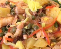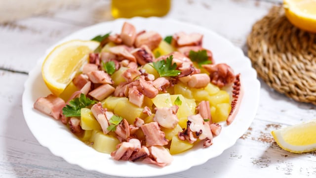 Vous cherchez une recette de salade originale ? Vous avez frappé à la bonne porte. En effet, à base de poulpe est de pomme de terre, cette salade est un délice. Avant de commencer à couper les autres ingrédients, vous devez faire cuire le poulpe dans un bouillon et faire cuire les pommes de terre à la vapeur. Ensuite, vous devez faire fondre le sel dans le vinaigre de Xérès. Pour relever le goût de la vinaigrette de votre salade de poulpe et de pommes de terre, vous allez rajouter du basilic, de la coriandre, mais aussi du piment d'Espelette. Si vous n'en avez pas, remplacez-le par quelques pincées de piment de Cayenne. Ensuite, pour amener de l'acidité et de la fraîcheur à votre salade de poulpe et de pommes de terre, vous allez rajouter des câpres et du céleri. Enfin, les tomates confites, le poivron rouge vont donner des couleurs à votre salade de la mer. C'est un délice !