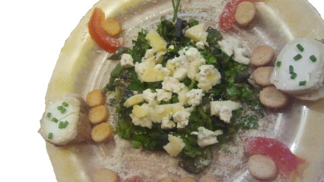 Laver, et couper la salade en lamelles. La disposer au centre de l'assiette. Couper les fromages en petits cubes en gardant de côté 2 tranches de chèvre. Ajouter les cubes de fromage à la salade.