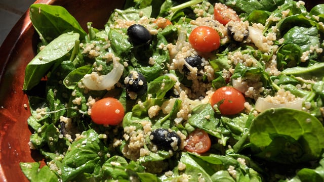 Laver les tomates, dénoyauter et couper les olives, laver et essuyer les épinards. Couper le fromage en petits dés et mettre tout avec le quinoa. Défaire l'œuf dur en petits bouts, ajouter.