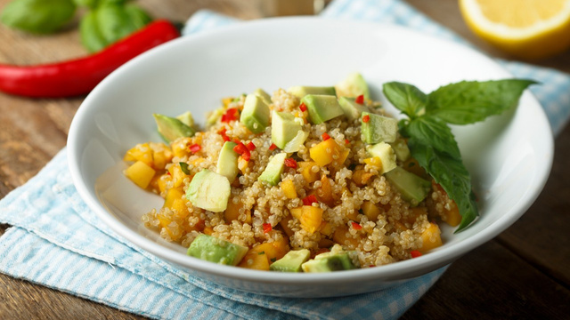 Mélanger le quinoa, ajouter les dès d'avocat et de mangue, arroser de sauce, ajouter les feuilles de menthe et le piment coupé en petits morceaux. Assaisonner de sel et poivre, arroser de jus de citron vert et servir.