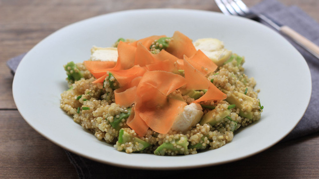 Coupez les avocats en deux, retirez le noyau puis la peau. Détaillez la chair en dés puis ajoutez-les au quinoa. Ajoutez la ciboulette, la vinaigrette et mélangez. Servez sur 4 assiettes avec les lanières de carottes et le crottin détaillé en copeaux à l’aide d’un couteau économe.