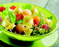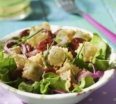 Sur chaque coin de la plancha, mettez à dorer les ravioles, les croutons de pain arrosés d'un filet d'huile d'olive, l'oignon rouge et le chorizo. Laissez cuire une dizaine de minutes. Servez tiède sur la salade assaisonnée et parsemez de ciboulette ciselée.