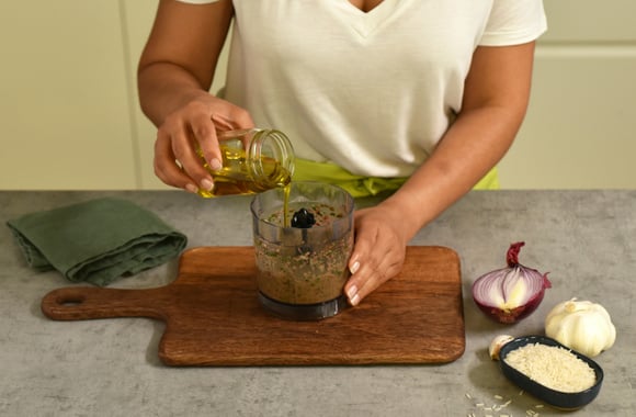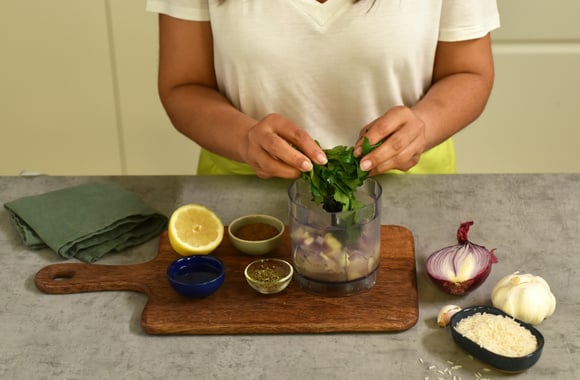 5Ajoutez le jus du citron, les feuilles de persil, l’origan, les épices, et mixez avec le vinaigre.
