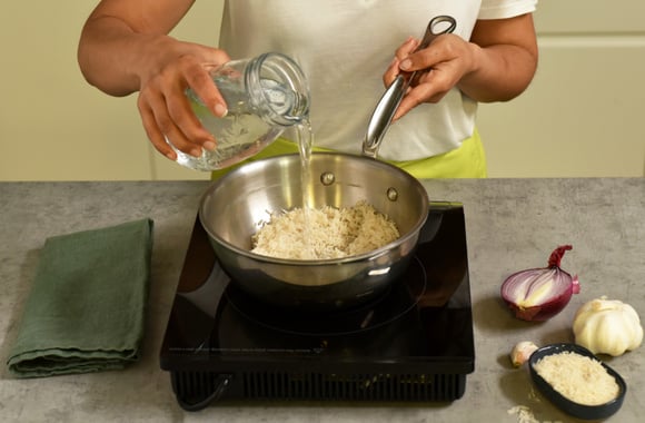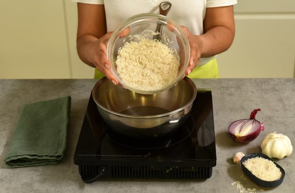 2Mélangez 2 volumes de riz pour 3 volumes d’eau et commencez à cuire le riz à l’eau froide et couvrez immédiatement la casserole. Laissez cuire 15 minutes à partir du moment où l’eau bout.